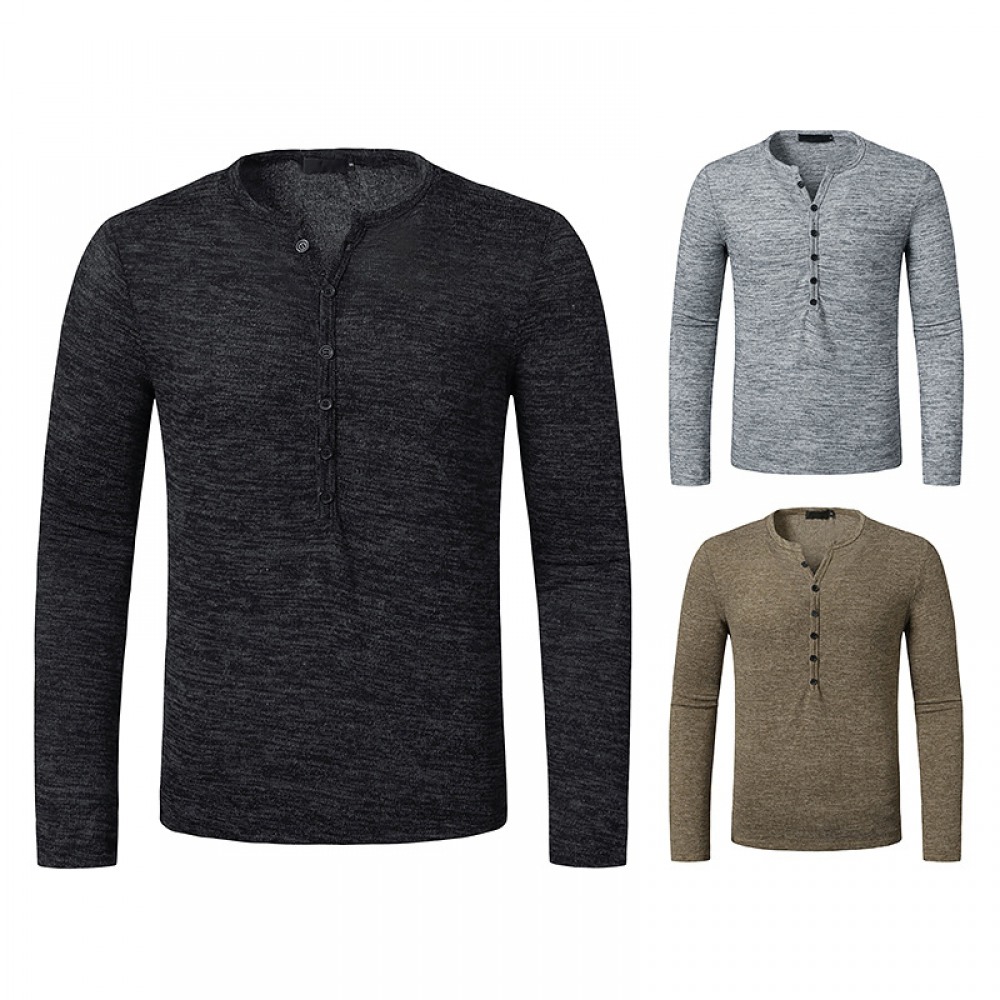 New Hollow Men's Autumn and Winter Long-Sleeved Base Waffle Henry Collar T-Shirt