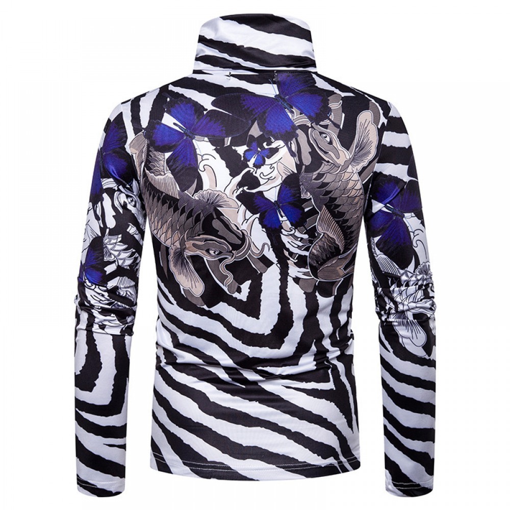 New Men's Large Size 3D Striped Carp Print High Neck Long Sleeve T-Shirt Bottoming Shirt